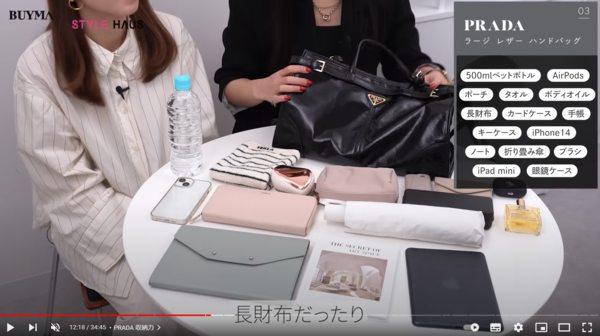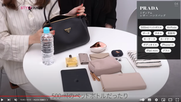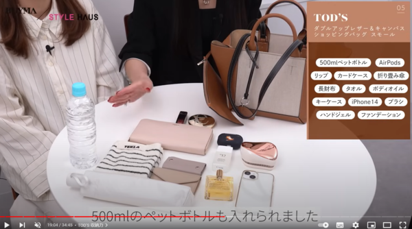 長財布や500mlのペットボトル、大きめのポーチがしっかりと入る収納力。仕切りをうまく使うと整理整頓しやすいバッグです。