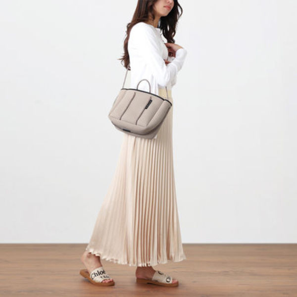 一番の特徴は、柔らかくて軽いのに丈夫なネオプレン素材と、バッグのアクセントにもなっているハンドル。カジュアルさが際立ちながらも、今っぽい色使いでコーデの洗練させてくれます。汚れても、洗濯機で丸洗いできるし、キーフックのついたポーチが内臓されていたりと機能面もバッチリです!
