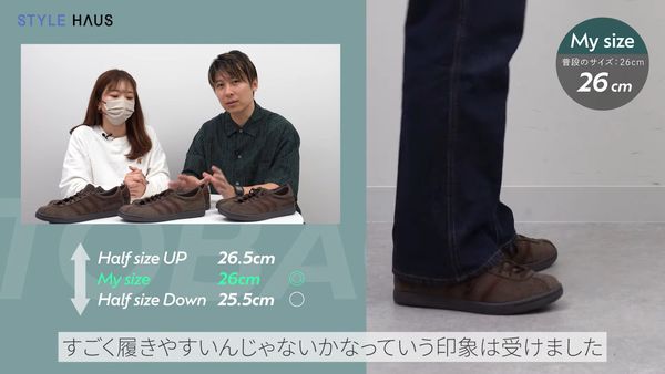 元々がレジャーシューズで足への負担を減らせるよう設計させているため、普段26.0cmを着用しているスタッフが26.0cmを履いたところ、少しゆとりのある印象でした。ただ大きすぎるという程ではないため、リラックスして履きたい場合はいつものサイズ、ジャストフィットで履きたい場合はハーフサイズダウンという選び方をすると良さそうです。