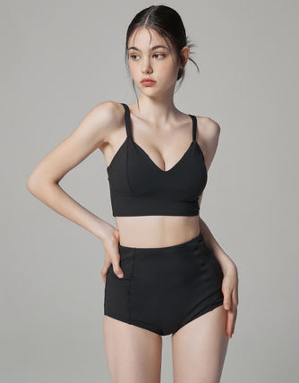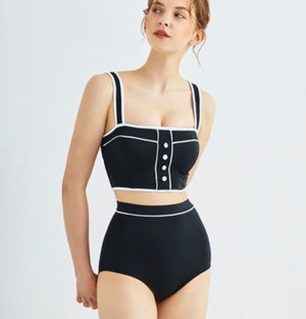ビスチェとボトムスのコントラストが鮮やかな Vikini Vender(ビキニベンダー)の水着。ハイウエストなボトムスと長めのトップスだから、お腹も肌見せの面積が少なくチャレンジしやすいです。