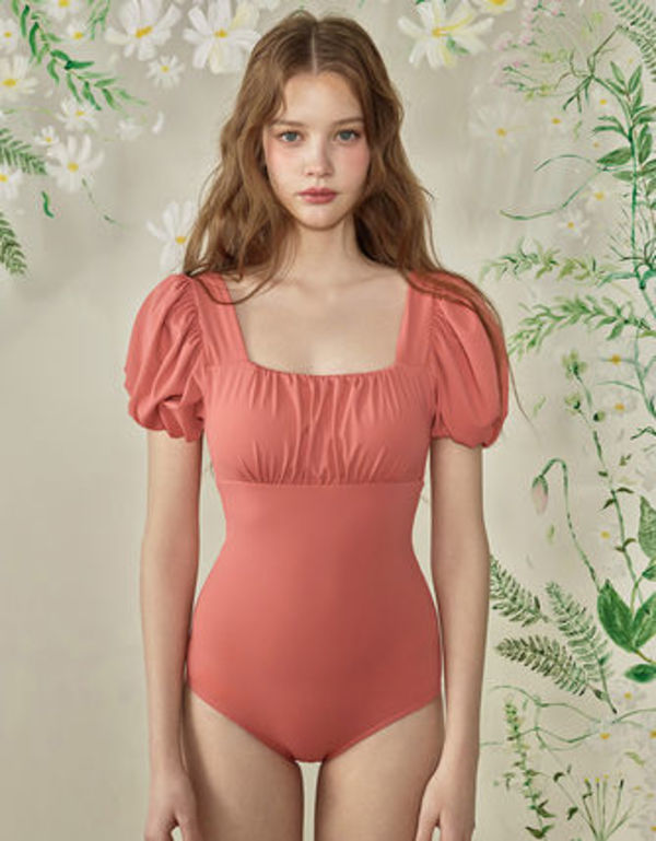 ワンピースタイプの水着は、胸下で切り替えられたデザインならスタイルアップ効果抜群!パフスリーブが大人ガーリーで、視線を上に集め顔まわりを華やかに演出します。スクエアネックのスッキリデザインもおすすめポイント♪