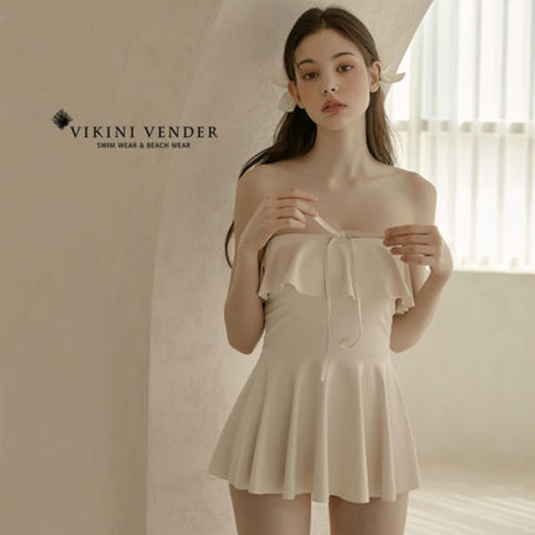 胸元にフリルがあしらわれたVikini Vender(ビキニベンダー)のワンピース水着。フリルスカートと相まって、くびれが強調され気になるお腹がほっそり見えします。ホルターネック付きなので、気分に合わせてさまざまな着方を楽しめますよ。