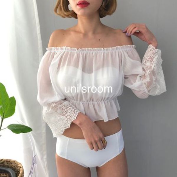 シンプルなビキニのセットアップに透け感のあるカバーアップがついたお得な3点セット♡今年らしいオフショルダーデザインで、肩まわりを華奢見えさせます。清潔感のあるホワイトカラーがヘルシーなお肌に引き立ててくれますよ!