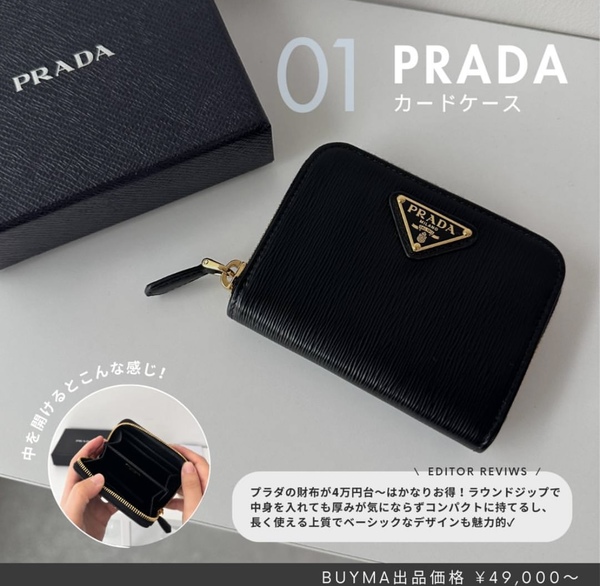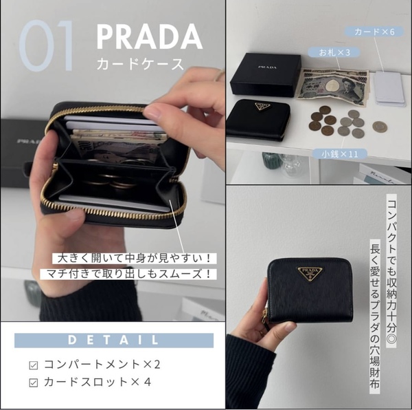 ☝初めてのミニマル財布としてもおすすめの小さすぎないサイズ感と収納力がおすすめのPRADAのカードケース。
