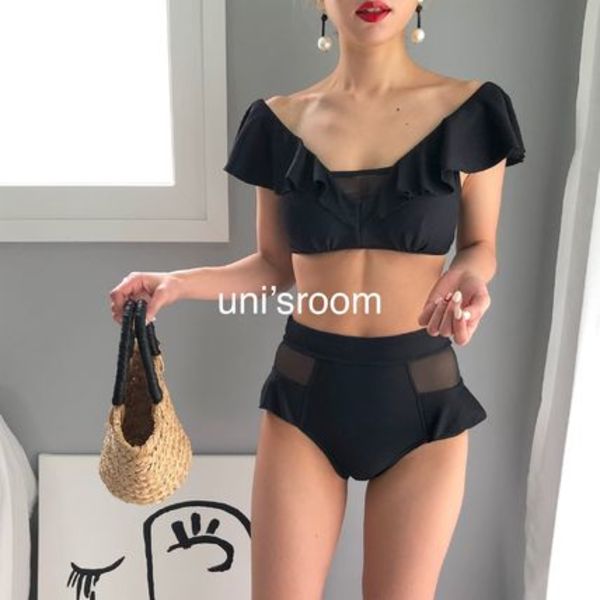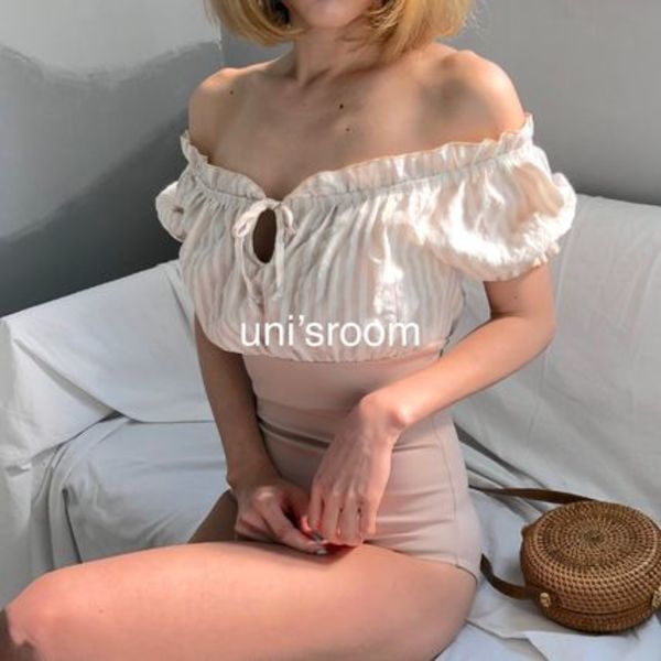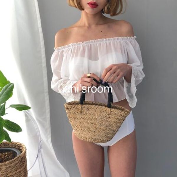 オフショルトップスになった水着なら、洋服感覚で着られて今っぽさ抜群♡フリルのついたデザインなら、ボリューミーで上半身を華奢見えさせてくれます。ショートパンツやスカートを合わせれば、さらに日常服に見えますよ♪