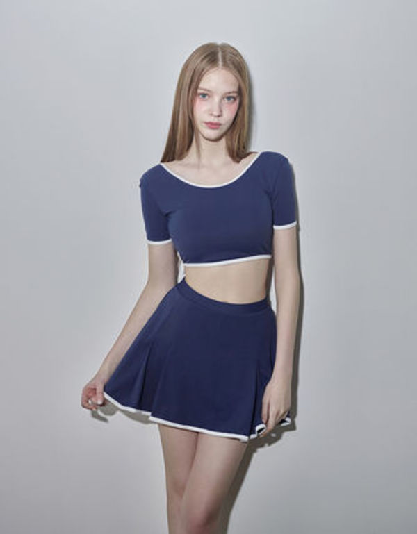 お尻カバーには、色選びも重要なポイントに。暖色系の膨張色より、ネイビーやブルー、ラベンダーなどの寒色・収縮色の方が全体がスッキリとして見えます。配色ラインが施された水着なら、レトロガーリーな雰囲気でトレンド感抜群です!!