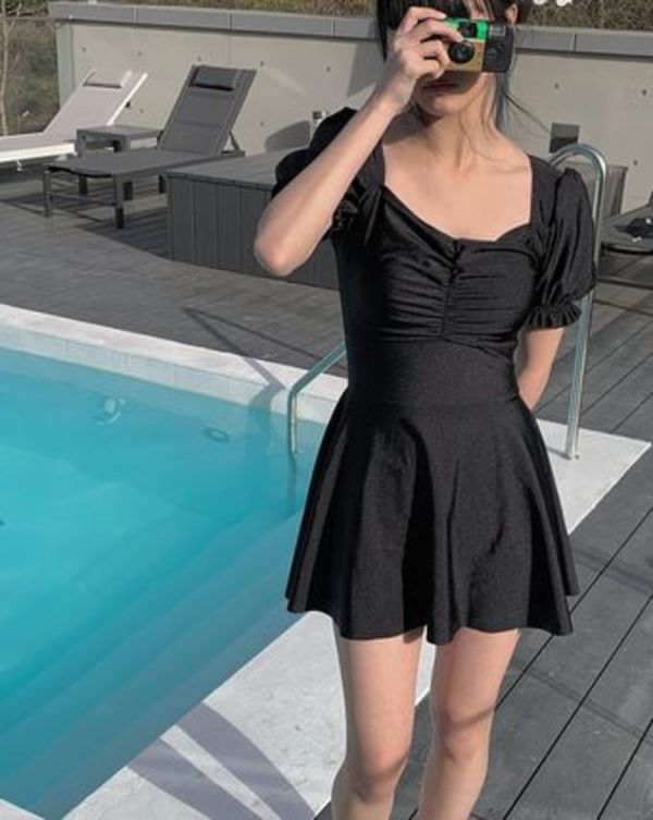 小胸さんは、ふんわりフレアなトップスの水着でボリュームを足すのが正解。自然に盛れるので、エロく見せたくないという方にもおすすめです。ビキニでもOKですが、ワンピースタイプなら大人可愛い雰囲気が今年らしいです。