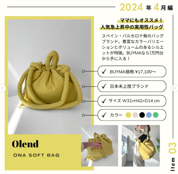 バルセロナで生まれた日本未上陸のバッグブランドOlend(オーレンド)は、SNS上でじわじわ注目度が上昇中。軽量かつ耐久性や機能性もしっかり兼ね備えているバッグ「ONA SOFT BAG」は、枕さながらの可愛らしい見た目にも定評があります。