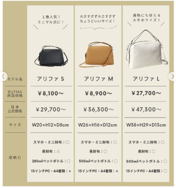 そして数あるなかでもアイコンバッグとして圧倒的人気を誇っているのが、トレンドや年齢に左右されずに日常使いしやすい「ALIFA(アリファ)」。現地価格でお買い物ができる海外通販サイトのBUYMAなら、なんと日本公式価格より2万円以上もお安く入手することができるんです。※出品者さんによって価格差あり
