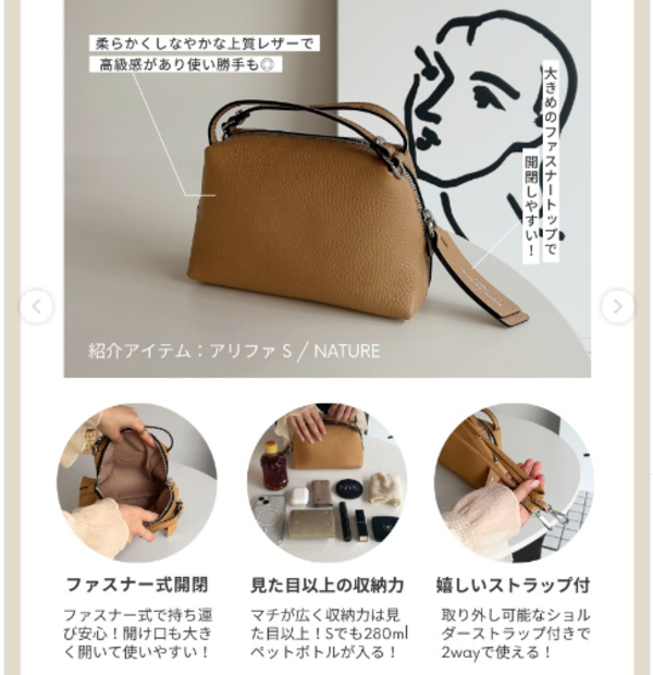 ALIFA(アリファ)が堅実な大人女性たちから支持されている大きな理由が、使い勝手の良さとデザイン性をしっかり兼ね備えているという点。必需品+αがきれいに入れられる頼もしい収納力や、あらゆる場面で使い回せる端正なフォルム、そして気分にあわせて2通りの持ち方ができる仕様が絶賛されています。