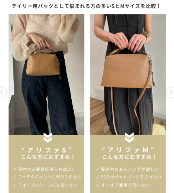 ALIFA(アリファ)は荷物の量や用途にあわせて選べるS・M・Lの3サイズを展開。なかでもデイリーユース向けなS・MサイズはBUYMAで1万円以下から入手することができ、大容量なLサイズは通勤バッグとしても大活躍してくれます。