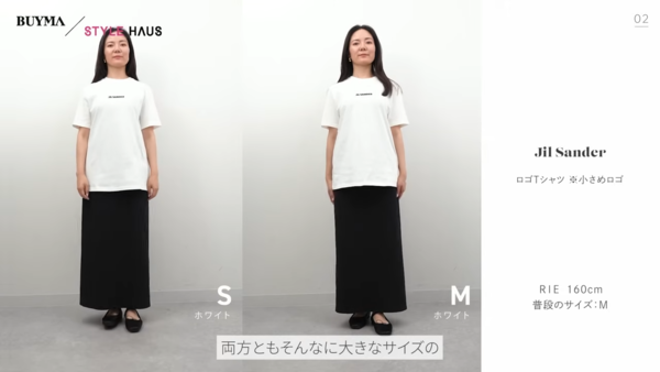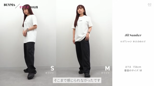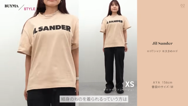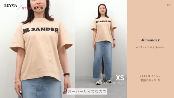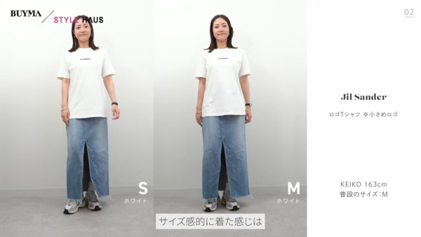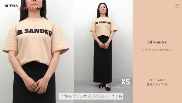 他ブランドに比べると、オーバーサイズなシルエットながらかっちりとしていてカジュアル過ぎないのがジルサンダーの特徴。今回は、小さめロゴの方をSとMで、大きめロゴのTシャツをXSを着てみました。