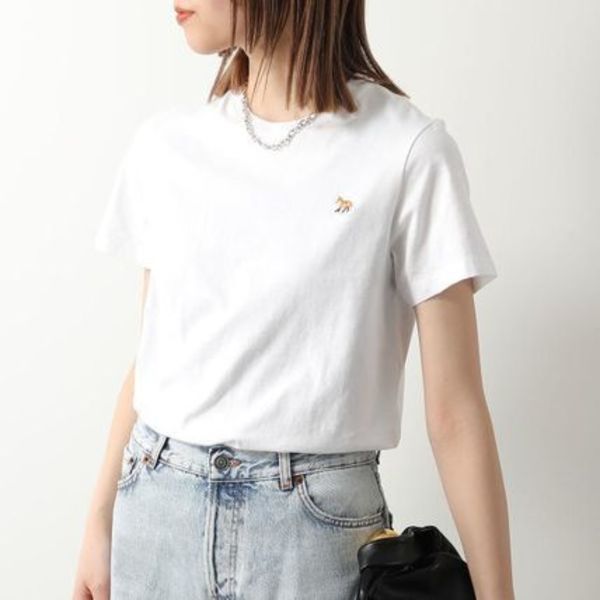 小さめロゴのTシャツは、SとMであまりサイズ感の違いがないよう。156cmスタッフの場合、若干襟ぐりがスッキリとして見えるSの方が短めのネックレスと相性が良さそうに感じたそうです。