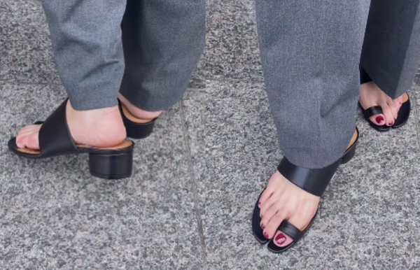 太めのアッパーベルトや親指をホールドするレザーストラップが足をしっかり支えるタビサンダルは、小走りできるほど歩きやすさも申し分なし。さり気ないスタイルアップを叶える円柱型の4cmヒールは見た目以上の安定感を約束してくれます。