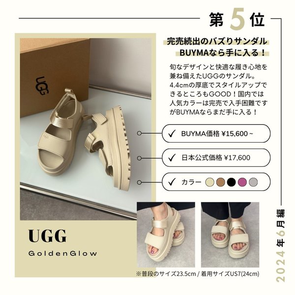 今季の大ヒットサンダルの一つがUGG(アグ)の『Golden Glow(ゴールデングロー)サンダル』!驚くほど軽量なのに履き心地も抜群だと評判で、水にも強いためどんな天候でも活躍してくれます。程よい厚底でトレンド感ある履きこなしも叶います♡