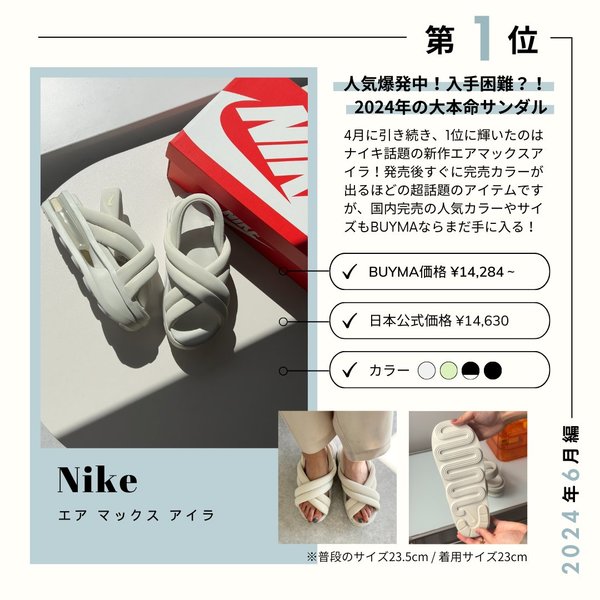 2024年の大本命サンダルが、Nike(ナイキ)の『エアマックスアイラ』!4月も脅威な売上でしたが、6月も引き続き1位という結果に♡Air Maxのクッションが搭載された厚底のソールとぷっくりとしたシルエットがかわいいサンダルで、現在国内公式サイトでは人気カラーの欠品が続いており入手困難になるほど大人気です。