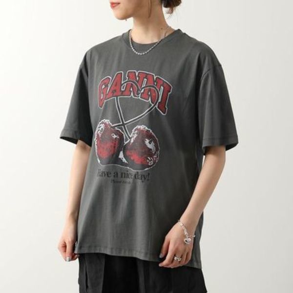 2024年は、ヴィンテージ感のあるグラフィックTシャツやロックなバンドTシャツがトレンド。Ganni(ガニー)のアイテムは、オーバーサイズ感でこなれた着こなしに。落ち着いたダークグレーなら、秋コーデにも好相性です。ルーズ過ぎないので、長めのアウターとも◎