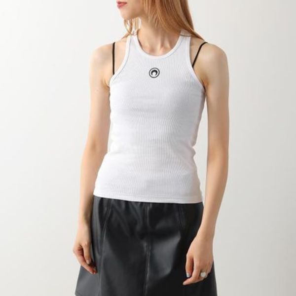 MARINE SERRE(マリーンセル)のタンクトップは、胸元のブランドロゴが一気にトレンド感を演出。ジャケットやアウターを羽織ったときも、チラリとロゴが見えて可愛いです。肩まわりのえぐれたアメスリデザインが今年らしく、1枚ならヘルシーな着こなしを叶えます。