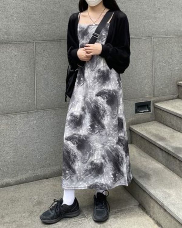 WONDER WONDER(ワンダーワンダー)のキャミワンピースは、マーブル柄がハイセンス♡夏は1枚で主役に、秋はカーディガンなどを羽織ると季節感が出ます。モノトーン配色なので、意外と着回しやすいです。