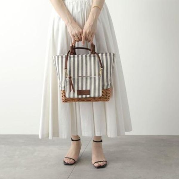 ストライプのキャンバスラタン素材が印象的なかごバッグ。A4サイズの書類なども収納でき、底の部分が安定しているためバッグを置いたときにくたっとならずに自立しておくことができるのも魅力。落ち着いた風合いと色味が大人っぽくカジュアルにもきれい目にも合わせられます。