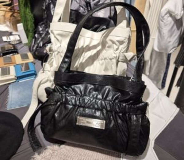 Matin Kim(マーティンキム)の2024年新作としてお目見えしたフェイクレザー製のミニバッグは、正面に飾られたロゴ入りのメタルプレートや両側にあしらわれたストラップが印象的なスクエア型。肩にかけやすいロングハンドル仕様で、オンオフ問わず幅広い着こなしに映える小粋なデザインです。