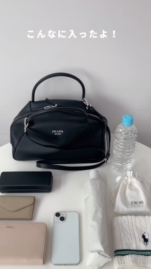 プラダのミニボストンバッグには、必需品に加えて500mlのペットボトルや日傘も収まりました!旅行や外出に必要なものがすべて入るため、荷物が多い人でも安心ですね♪