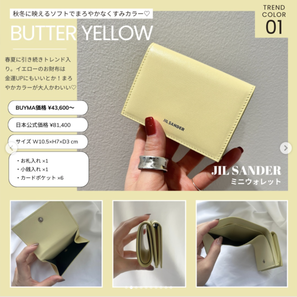春夏に引き続きトレンド入りしているバターイエロー。暗くなりがちな秋冬の装いにも映える、ソフトでまろやかなくすみカラーです。イエローのお財布には金運アップにも良いとされています。