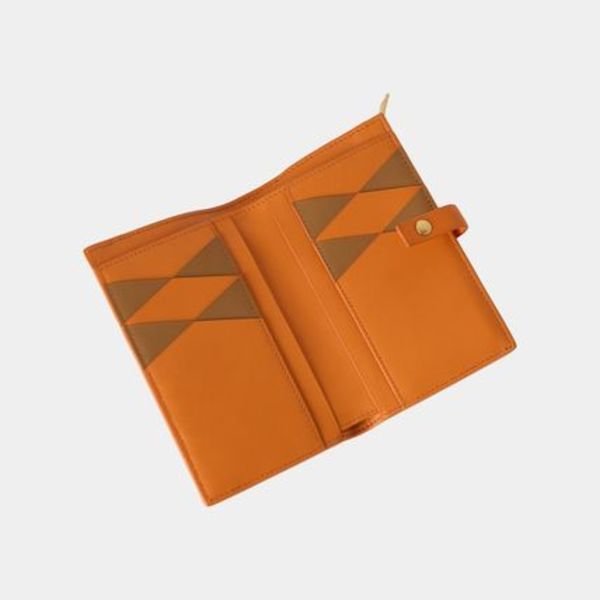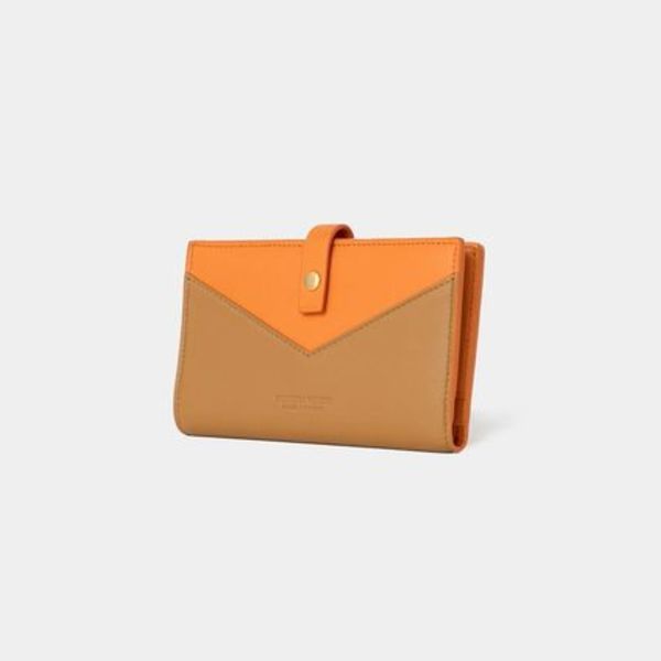 オレンジ×ブラウン配色の「フラップ付き二つ折り長財布」