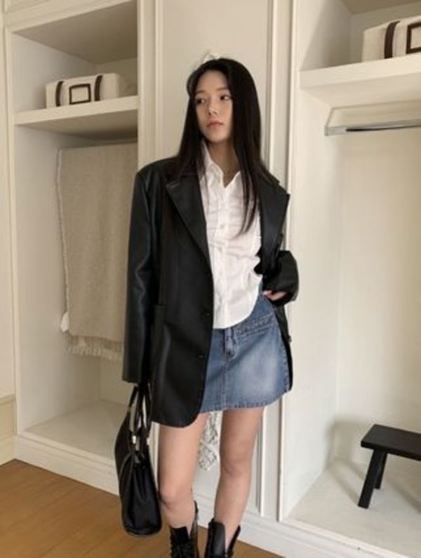 レザー×ジャケットなら新境地に。かっちりスタイルに見えやすいジャケットをレザー素材にするだけで一気に甘辛い印象に落とし込むことが可能に。ミニボトムとの相性も◎