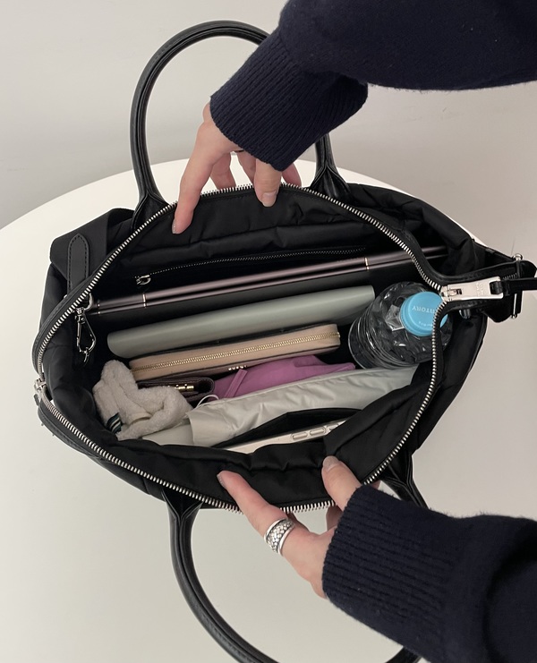 軽くて大容量なRe-Nylonミディアムパテッドトートバッグ。長財布やタブレット、500mlのペットボトルまで収納できます!毎日の通学・通勤やちょっとしたお出かけ、週末のお泊りや旅行など、様々なシチュエーションにしっかり対応できる収納力が魅力です。