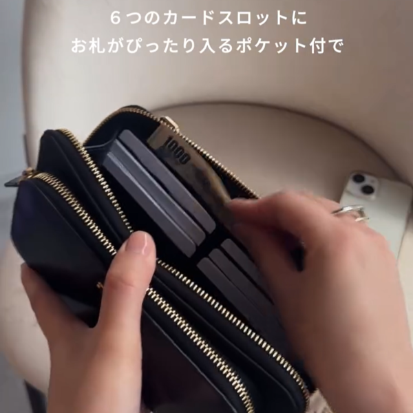 カードスロットだけでなくお札入れや小銭を入れられるファスナー付きポケットも付いているので、お財布としての利便性も間違いなしです。