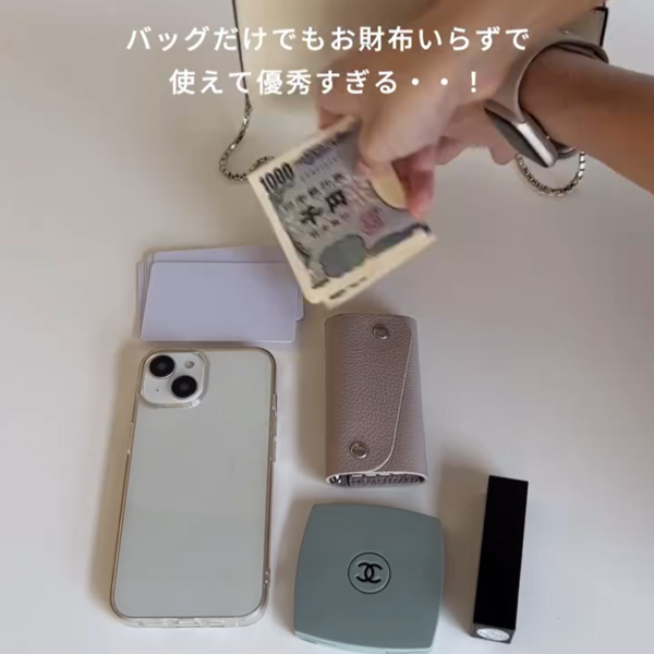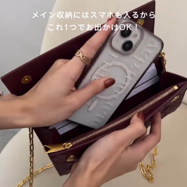 スマホはもちろん、リップやキーケースまで入る収納力で、ミニバッグさながらの実用性を備えています。