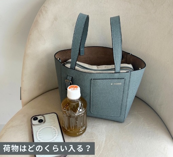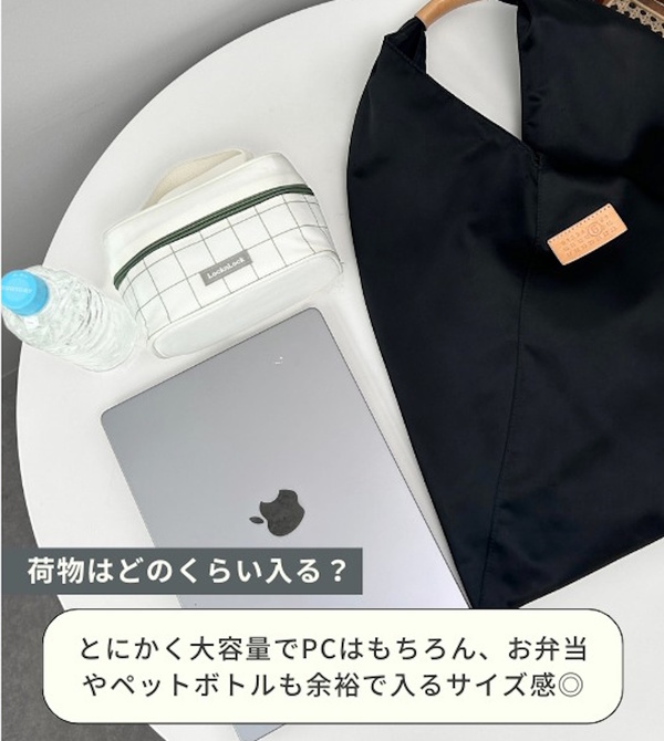 マチがたっぷりで、PC・お弁当箱・500mlのペットボトルを入れても余裕があり、見た目以上の収納力を備えています。またミニポーチが付いているので、鍵やリップなどの小物もしっかり収納できます。ガバッと開く開口部と広めのマチを備えた優秀バッグです。