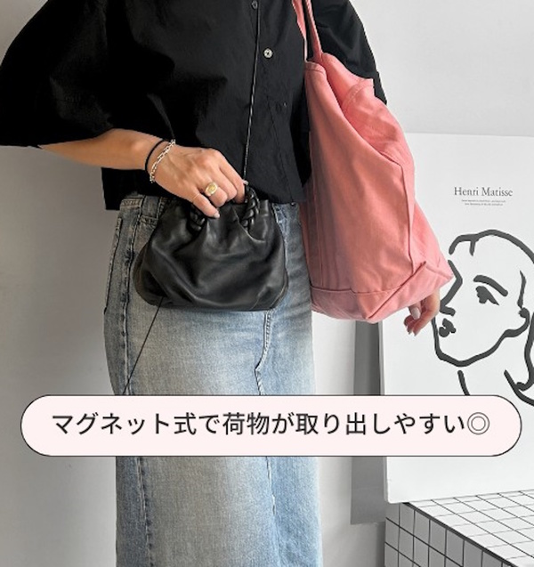 マグネットで開閉でき、荷物が取り出しやすく◎。またサイドのスナップボタンでマチ幅を調節できる、便利な仕様です。