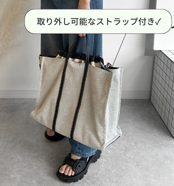 長さ調整可能なストラップ付きで2Wayで持つことができます!また底にはフェイクレザー生地を使用しており、汚れ&型崩れ防止とそんな気遣いも嬉しいところ♡