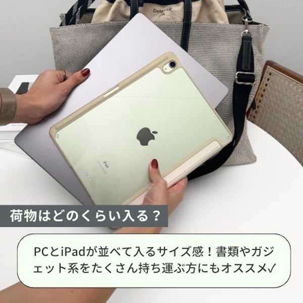 とにかく大容量で、PCとiPadが並べて入ります。それでもまだ余裕があるので、書類やガジェット系をたくさん持ち運ぶ方にもおすすめです♡