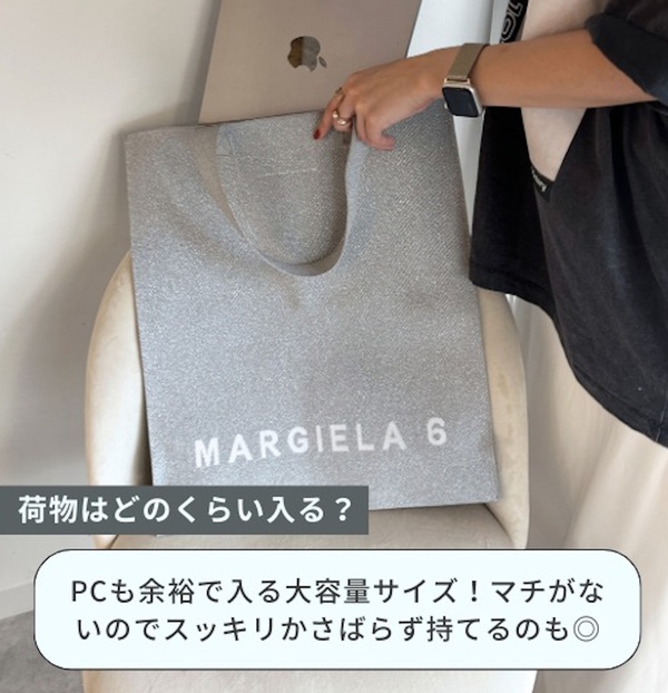 ガシガシ物を入れてもヘタらず、軽くて使い心地もよいMM6(エムエムシックス)のMILANOトートを愛用しています!上品なシルバーラメでファッションのポイントともなるし、A4サイズの書類やPCも入って通勤バッグにも最適です。MM6(エムエムシックス)はBUYM(バイマ)で割引率が高く、かなりお得にゲットできました♡