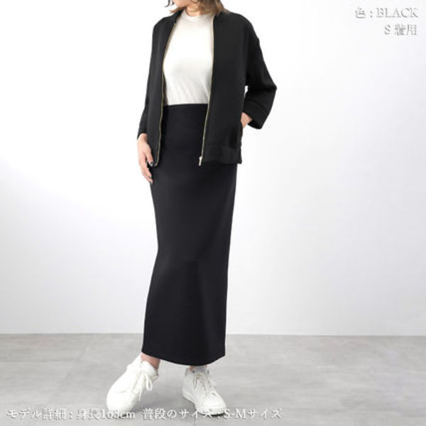 長さはストレートに落ちて、ふくらはぎが隠れるくらいのちょうど良い丈感。タイトなシルエットながら、バックに深めに入ったスリットが軽快な足捌きを叶えます。