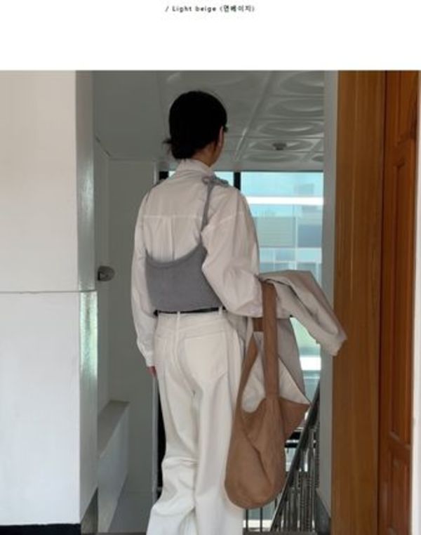 縦横45.5cmのビッグサイズなショルダーバッグです。シンプルながらインパクトのあるサイズ感で、スタイリングのポイントに。中身はパンパンに詰め込みすぎず、くったり感をキープしつつ持つのが今っぽい!