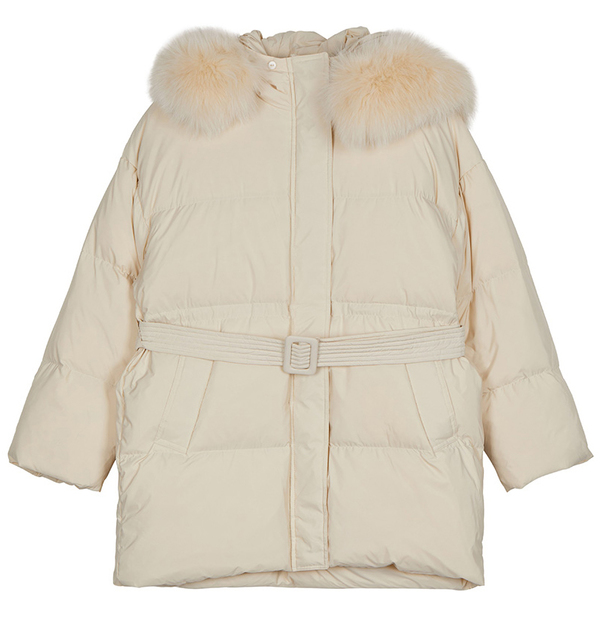 ミニマルなシルエットの「Loe fur padded jacket」。ボリューミーなファーが顔まわりをラグジュアリーに彩り、小顔効果も抜群です。ベルトでウエストマークすることで着膨れの心配なく、スタイリッシュに着こなせます。