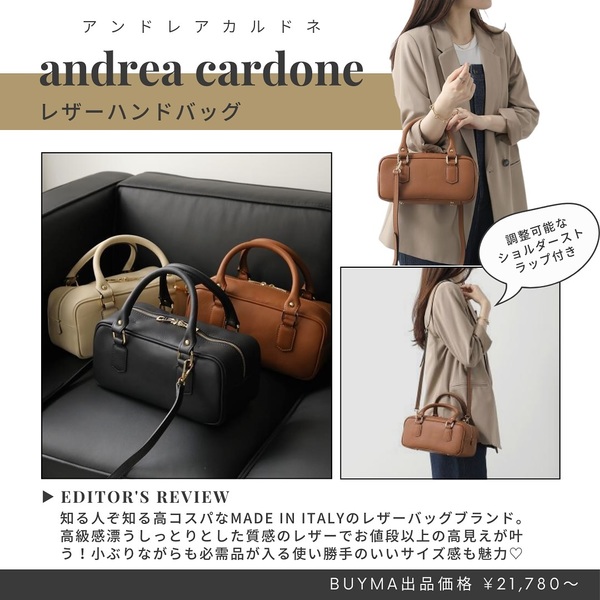 レザー業界で、50年の歴史をもつイタリアのバッグブランド・andrea cardone(アンドレアカルドネ)。原料は全てイタリア産にこだわり、今でもMADE IN ITALYにこだわったもの作りを行っています。そのため品質と優雅さを兼ね備えたデザインのバッグが揃います。