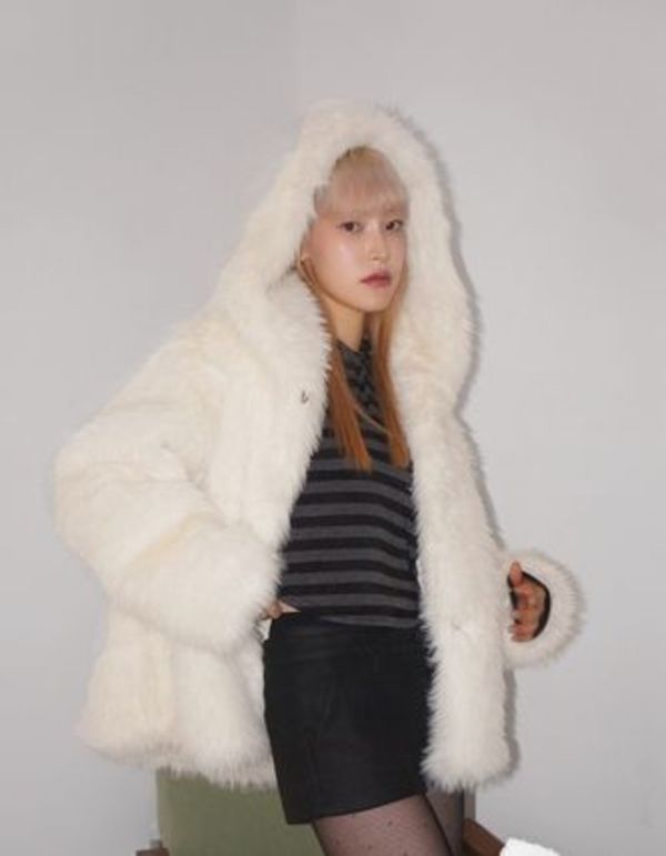 毛足が長いファーアウター。襟がある形だと白のファーで少し甘くなりすぎるかなという方におすすめ。フードが付いているのでファーとホワイトのカラーの甘さのバランスが取れ大人でも取り入れやすい一枚になっています♡程よいボリューム感があるのもミニ丈のボトムスとも相性抜群!