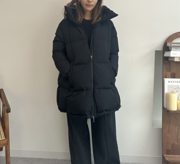 丈感が気になる薄手派の方は1サイズ、丈感は気にせず厚着派の方は2サイズ上げても問題なさそうですね。とっても可愛いシルエットのダウンです!