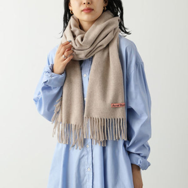 △ Acne Studios(アクネストゥディオス)のマフラーは、モード派さんなら1つは持っていると言っても過言ではない人気アイテム。あえて柔らかいブラウンを選べば、周りと被ることなし。ピンクのブランドロゴが映えます。