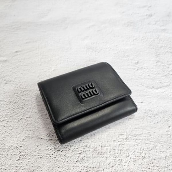 ぷっくり立体的になったブランドロゴが可愛いMiuMiu(ミュウミュウ)のミニ財布♡オールブラックなのに女性らしさを忘れません。