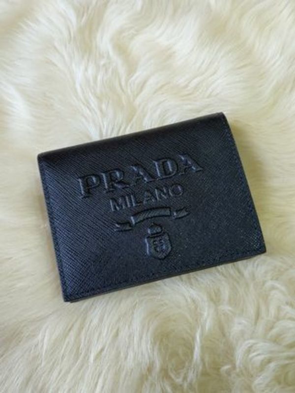 プラダロゴがエンボス加工で大胆に施された高級感のある二つ折り財布。ブラックなら、ハイブラ感を主張しすぎることのないさりげなさがあります。