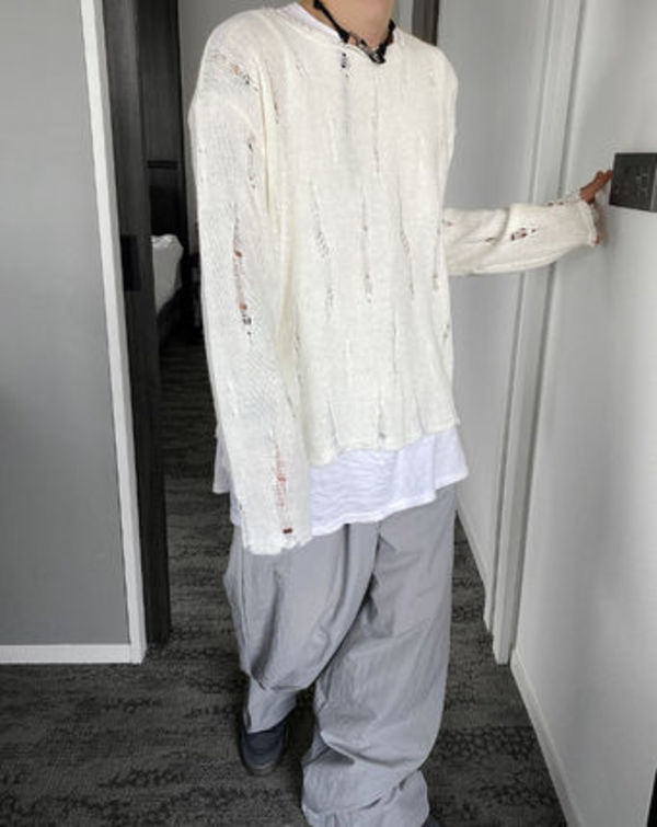 クラッシュダメージのモヘアニットはかなり珍しいデザインなので、一枚は持っておきたいニット。今季話題のマイルドストリートにも合うアイテムで、下記画像のようにレイヤードコーデがオススメです。
