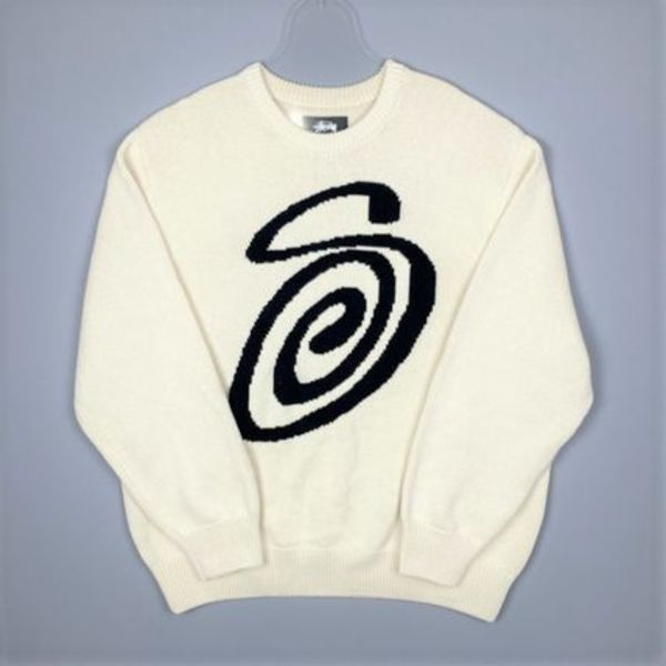 ステューシーでお馴染みのCURLY Sを大胆にレイアウトしたニットはいかがでしょう。ゆったりめオーバーサイズな着こなしを目指し、ワイドボトムと合わせれば、今っぽい冬のスケーターコーデの完成です。