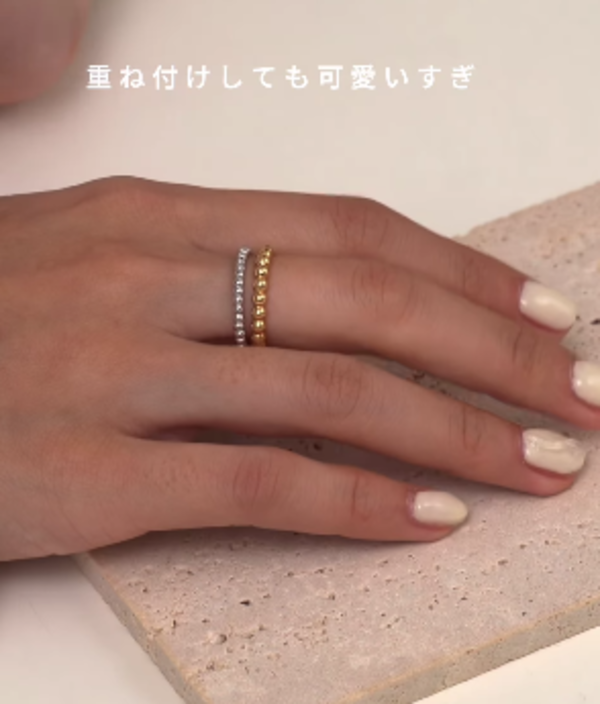 愛用しているリングや結婚指輪など、ブランドを問わず重ねづけがしやすいのも『ペルレ』ならではの魅力。色違い・サイズ違いの『ペルレ』をふたつ重ねるのも◎。