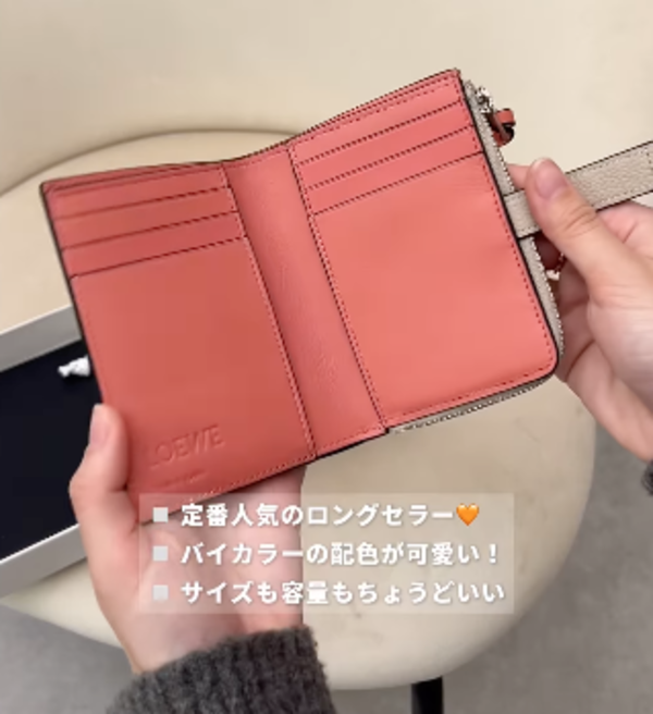∟持つだけで気分が高揚すると話題なのが、LOEWE(ロエベ)のバイフォールドウォレット!特にアクセントが映えるバイカラーデザインが人気で、縦に配置された6つのカードスロットの裏に4つのポケットがある、計算された構造が特徴です。小銭入れの引き手により、開閉しやすいだけでなく、デザインのポイントにもなっているのも素敵なんです。